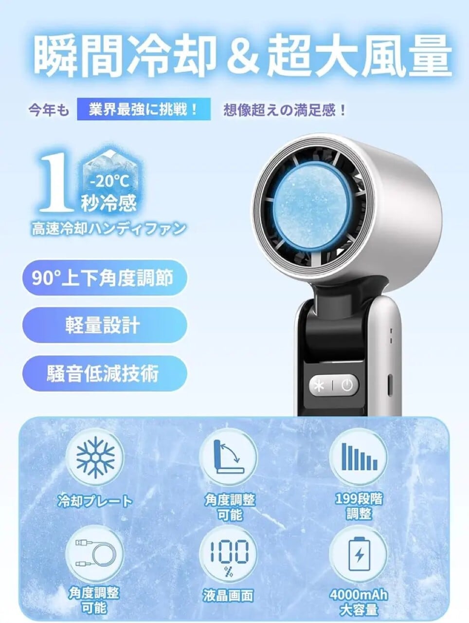 【100段階精密調節&7m/s超強風】 液晶画面には、電量表示と風力表示が-目でわかり、風量調節も簡単に行えます。1~100段階の微調整可能な無段階風量調節で、お好みの風量を細かく設定可能。最大風速7m/sの超強風で、暑い夏でも-瞬で涼しさを実感!デジタル画面で風量とバッテリ-残量が一目で確認できます。